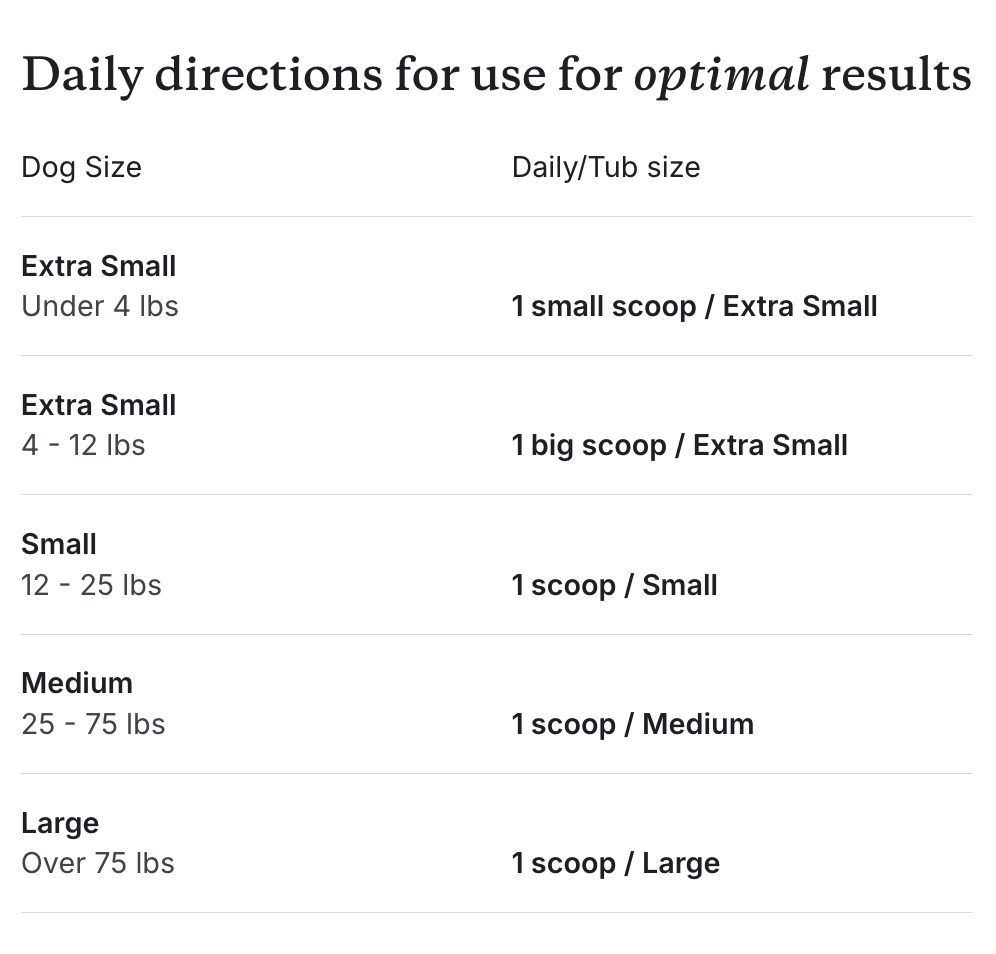 Takes just seconds of use a day – no toothbrush or fuss required. One scoop fits easily into your dog’s daily routine.
