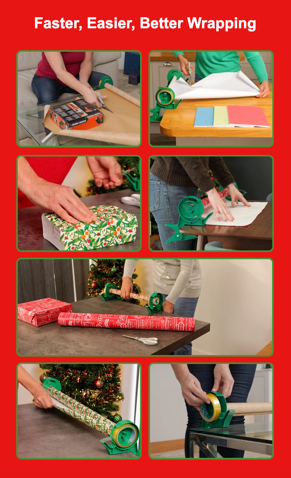 No more juggling scissors & tape and wrestling unruly wrap